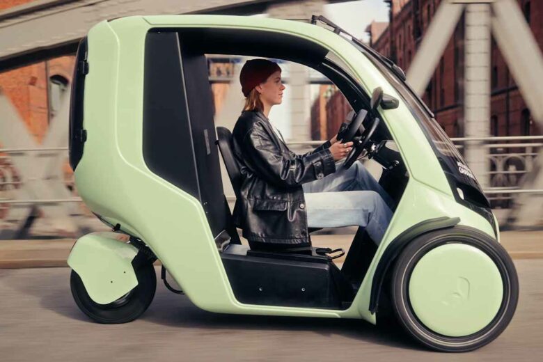 Door de kap ben je beschermd tegen wind en regen, net zoals in een auto.